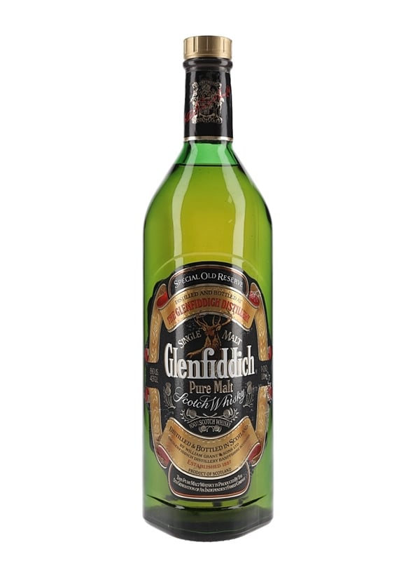A litre bottle of Glenfiddich Special Old Reserve Pure Malt Scotch Whisky produced by William Grant & Sons Ltd. We estimate this was bottled in the 1980s.