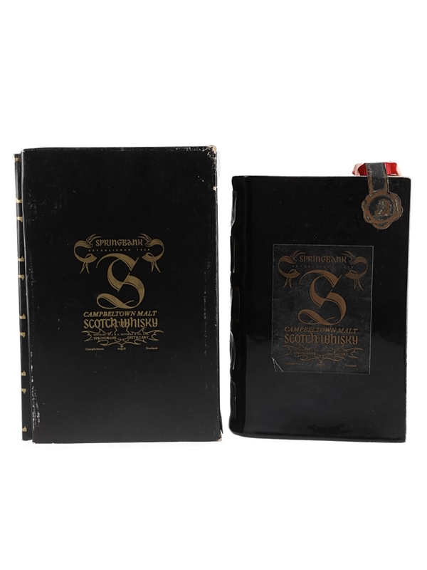 A bottle of Springbank 10 Year Old Volume I Campbeltown Malt Scotch Whisky presented in a ceramic book-shaped decanter. This was imported to Italy by Consorzio Vinicolo, we estimate in the 1980s.