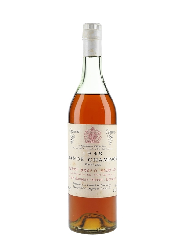 A 68cl bottle of 1948 Grande Champagne Cognac, bottled in 1976 in France by P Frapin & Co. for UK wine and spirits merchant Berry Bros & Rudd.