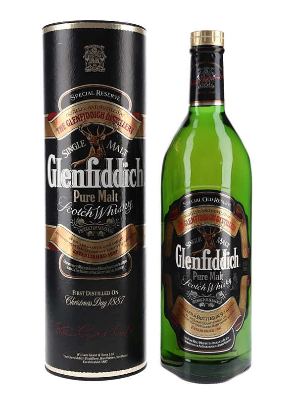 A litre bottle of Glenfiddich Special Old Reserve Pure Malt Scotch Whisky. We estimate this was bottled in the 1990s.