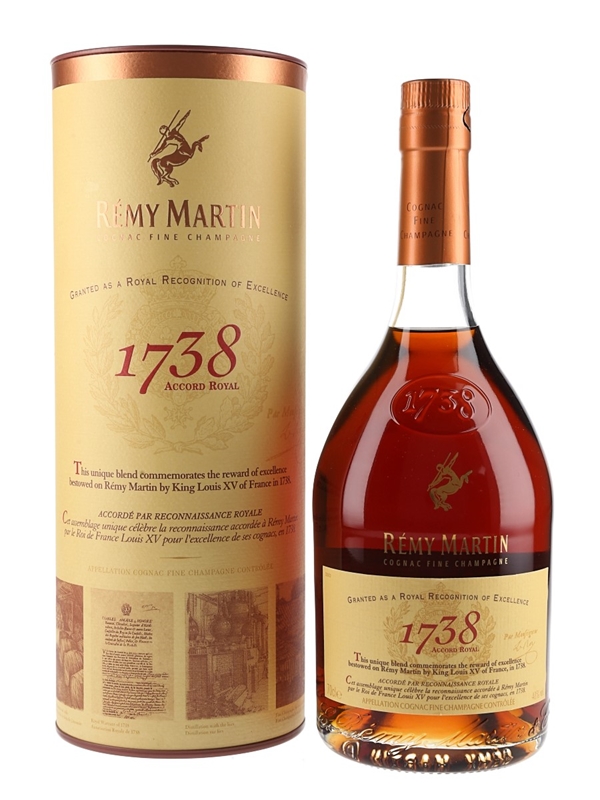 A bottle of Rémy Martin 1738 Accord Royal Fine Champagne Cognac. This blend commemorates the reward of excellence bestowed on Rémy Martin by King Louis XV of France in 1738.
