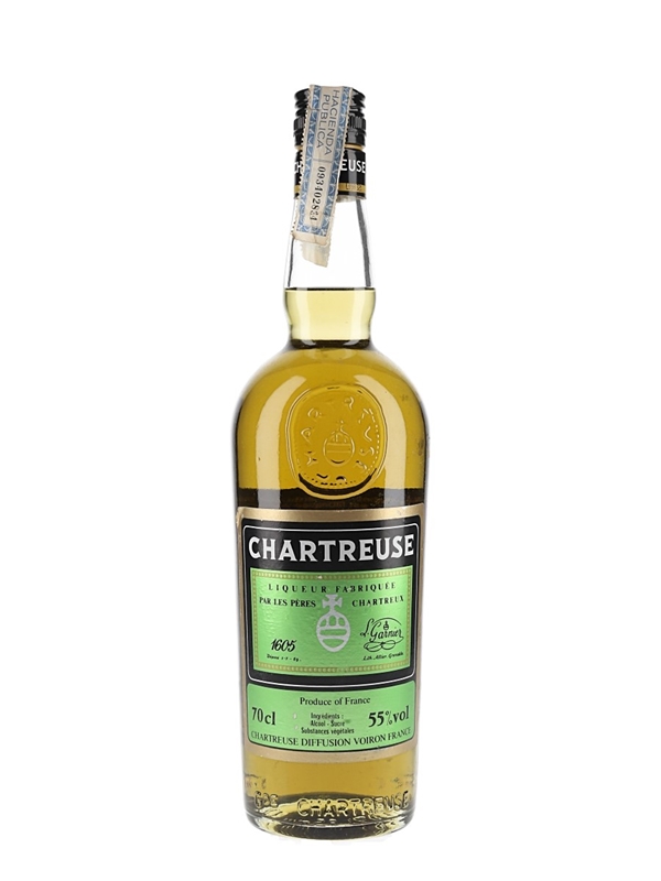 A bottle of Chartreuse Green liqueur from France. The bottling code indicates this was bottled in 1992.
