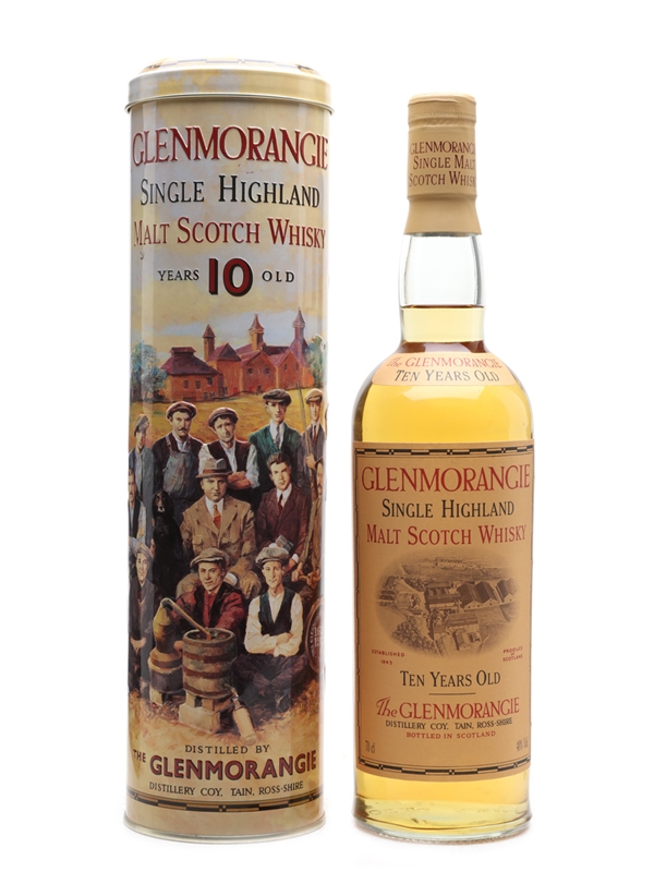 An old presentation bottle of Glenmorangie 10 Year Old. The tin is embossed with an image of the 16 Men of Tain, the makers of Glenmorangie.