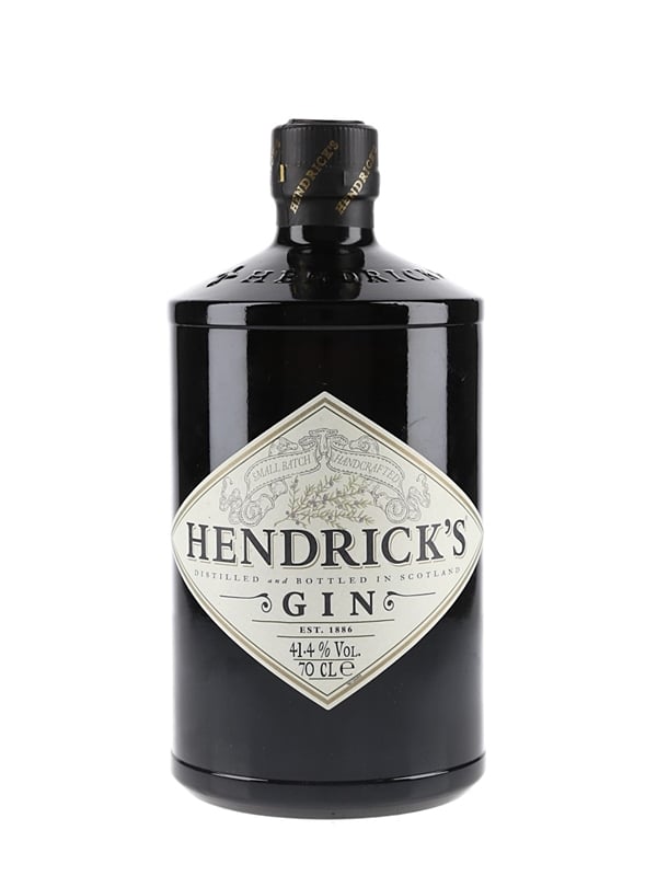 A bottle of Hendrick's Gin, produced in Scotland in small batches to a recipe which includes juniper, coriander and citrus peel, as well as cucumber and rose petals.