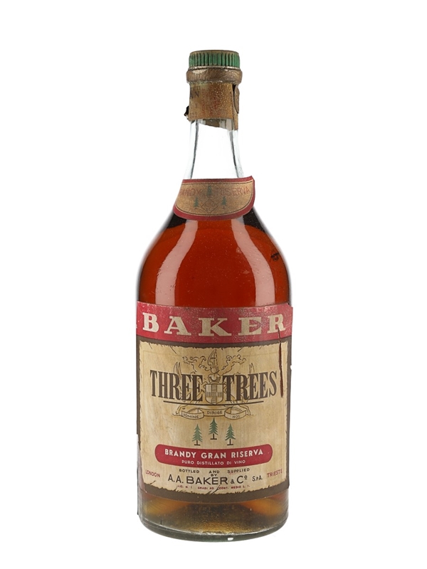 A litre bottle Baker Three Trees Brandy Gran Riserva produced in Trieste, Italy. We estimate this was bottled in the 1950s.