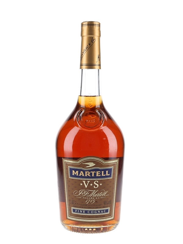 A litre bottle of Martell 3 Star VS Fine Cognac. We estimate this was bottled in the 1990s. Please note, the front label is partially unstuck from the bottle.