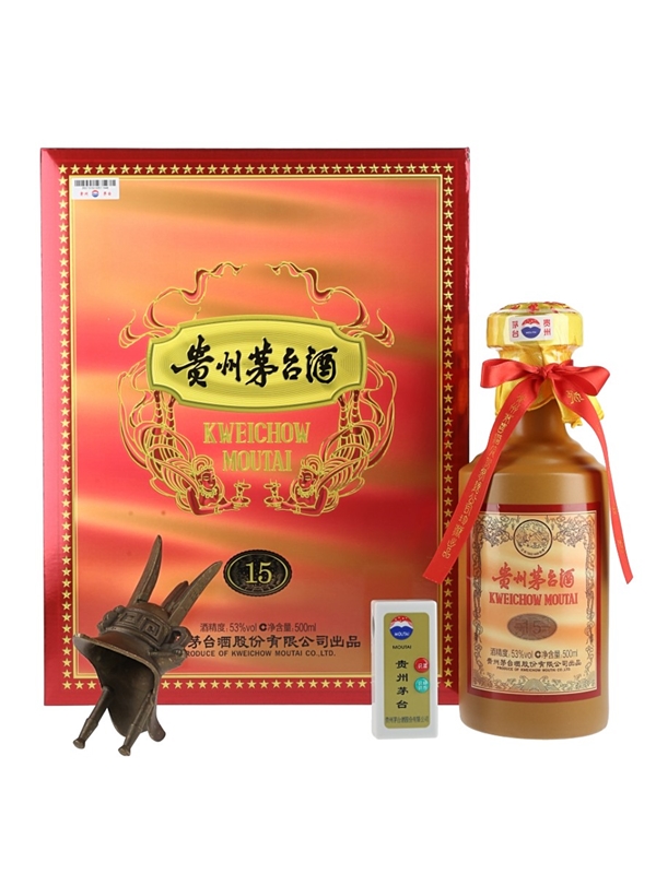 A 50cl bottle of Kweichow Moutai 15 Year Old baijiu, presented with a metal cup. The bottling code indicates this was bottled in 2023.