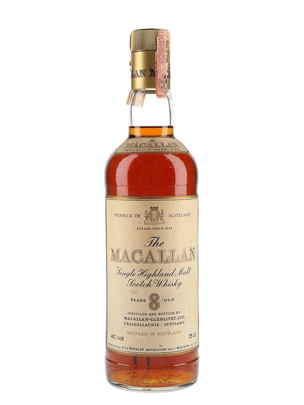 A bottle of The Macallan 8 Year Old Single Highland Malt Scotch Whisky. This was matured in sherry wood and imported to Italy by Rinaldi, we estimate in the 1980s.