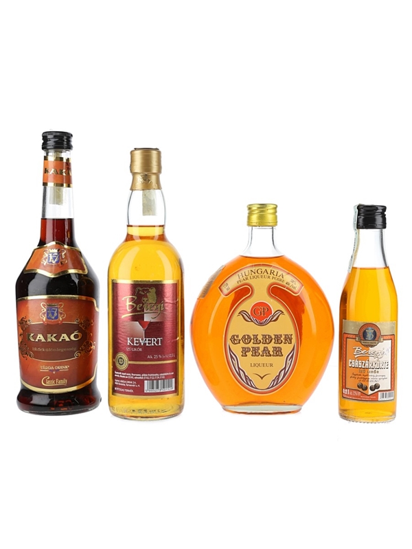 This lot contains four bottles of Hungarian liqueur including Beregi Csaszarkorte, Golden Pear, Kevert and Kakao.