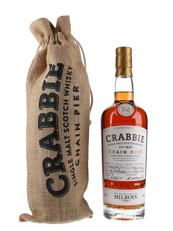 A bottle of Crabbie Chain Pier 3 Year Old Lowland Single Malt Scotch Whisky. This was distilled in 2019, matured in a single shiraz cask and bottled at 57.8% ABV in 2022 by John Crabbie & Co.