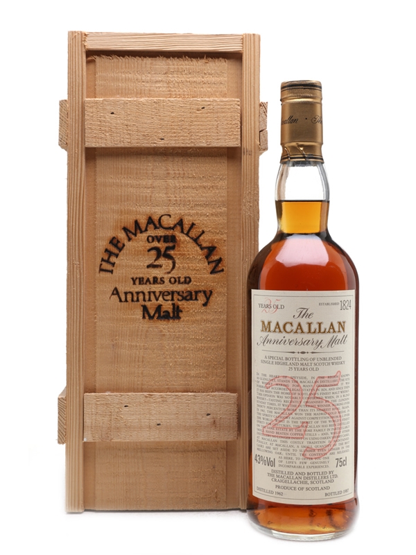 A bottle of The Macallan 25 Year Old. This was distilled in 1962, matured in sherry casks and bottled in 1988 for the Anniversary Malt series.