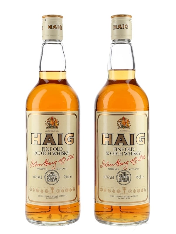 This lot contains two bottles of Haig Fine Old Scotch Whisky, produced by John Haig & Co Ltd. We estimate these were bottled in the 1980s.
