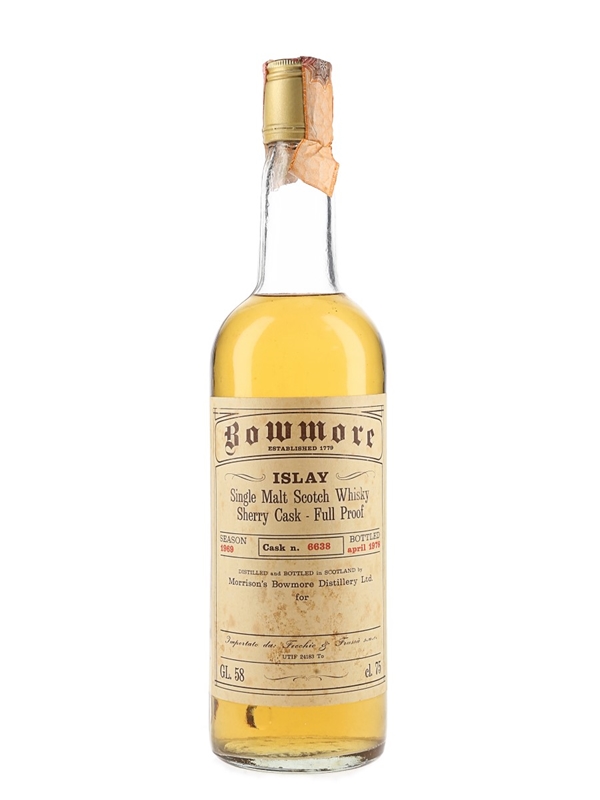 A bottle of Bowmore Islay Single Malt Scotch Whisky. This was distilled in 1969, matured in a single sherry cask before being bottled at natural cask strength in April 1978 for Italian imported Fecchio & Frassa.