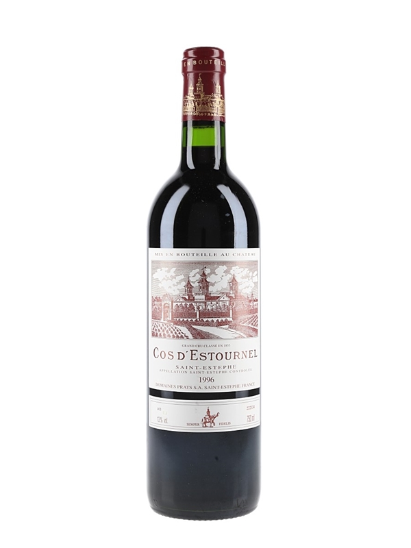 A bottle of 1996 Château Cos d'Estournel, a 'super second' growth in the 1855 Classification, from the Saint-Estèphe appellation in Bordeaux.