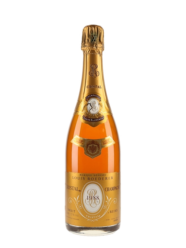 A bottle of 1988 Louis Roederer Cristal Vintage Champagne, a 60% Pinot Noir and 40% Chardonnay blend.