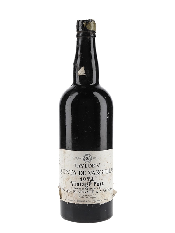 A bottle of Taylors 1974 Quinta de Vargellas single quinta port, bottled in 1976 by Taylor, Fladgate & Yeatman and imported to the UK by Deinhard & Co. Ltd.