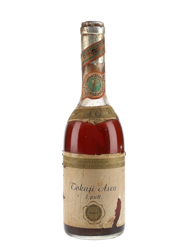 A bottle of 1963 Tokaji 3 Puttonyos Aszú dessert wine, produced by Allami.