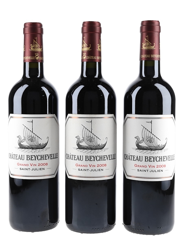 This lot contains three bottles of 2008 Château Beychevelle Grand Vin from Bordeaux's Saint-Julien appellation.