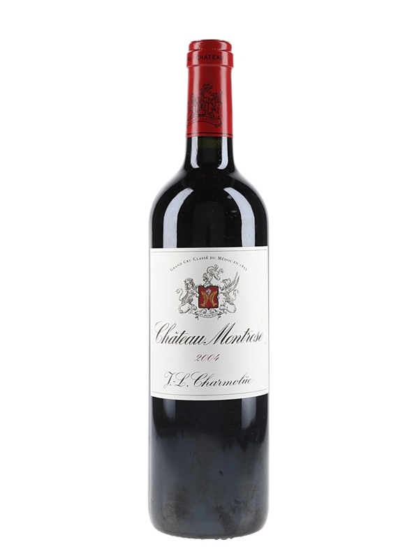 A bottle of 2004 Château Montrose, a second growth in the 1855 Classification from the Saint-Estèphe appellation in Bordeaux.