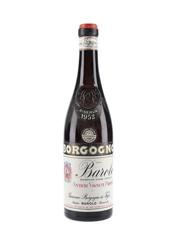 A bottle of 1952 Borgogno Barolo Riserva, produced and bottled by Giacomo Borgogno & Figli.