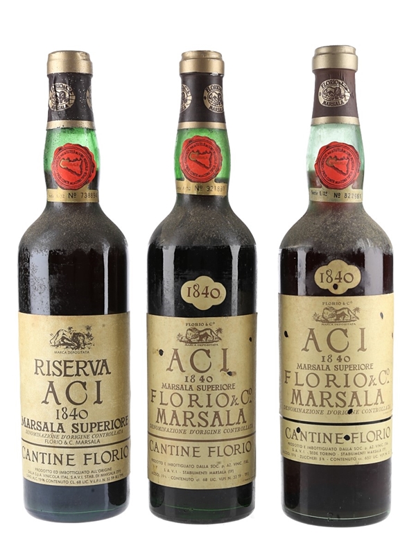 This lot contains three 68cl bottles of Florio Aci 1840 Marsala Superiore, a fortified wine produced in Sicily.