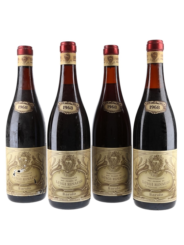 This lot contains four bottles of 1968 Luigi Einaudi Barolo from Dohliani, Italy.