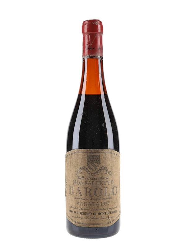 A bottle of 1977 Cordero di Montezemolo Monfalletto Barolo from Italy harvested from 14 hectares of vineyards in the La Morra commune.
