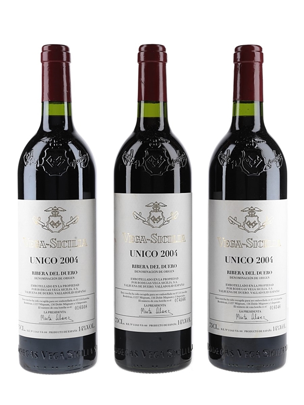 This lot contains a set of three bottles of 2004 Vega Sicilia Unico Spain's Ribera del Duero region. This blend features around 15% Malbec and Merlot, with the balance made up of Tempranillo.