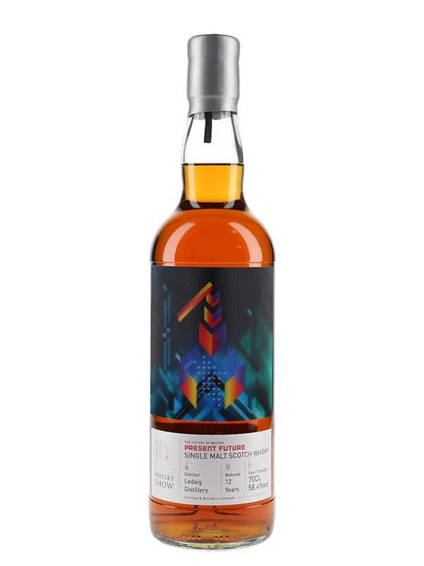 A bottle of Ledaig 12 Year Old Present Future Single Malt Scotch Whisky. This was distilled in 2005 and bottled as a part of The Future of Whisky series from The Whisky Exchange at a cask strength of 58.4% ABV, a range showcasing the past, present and future of Scotch whisky. This was released for The Whisky Show 2018 and it has a 3d lenticular label featuring a futuristic depiction of a pot still.