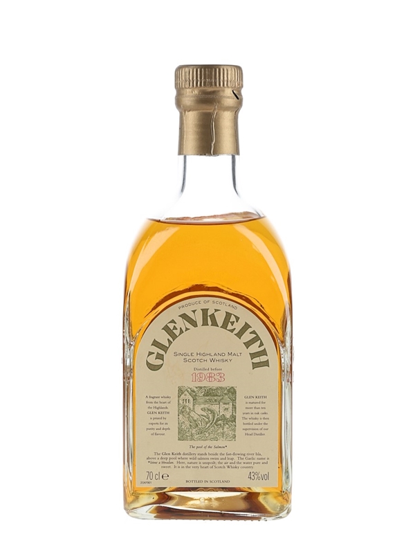 A bottle of Glen Keith Single Highland Malt Scotch Whisky. This was distilled before 1983 and matured for more than 10 years.