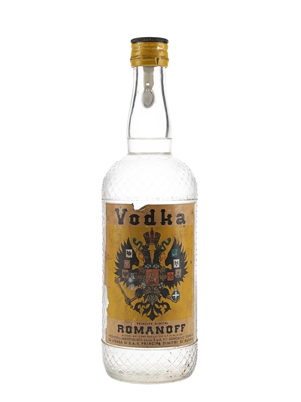 A bottle of Romanoff Vodka from Italy, produced by Gancia & C. under licence from Il Principe Dimitri di Russia. We estimate this was bottled in the 1950s.