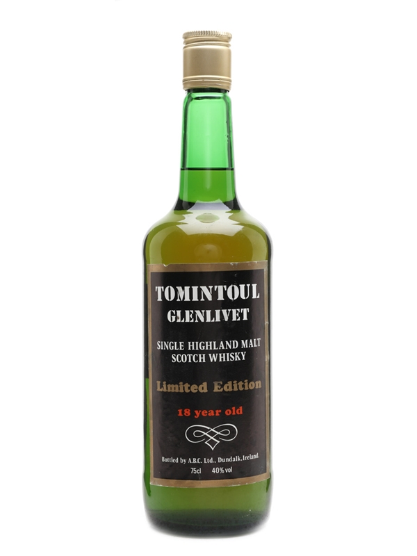 A bottle of Tomintoul 18 Year Old, distilled in 1967 and bottled by Irish bottler ABC Ltd in 1985, when many Speyside distilleries still used the 'Glenlivet' suffix.