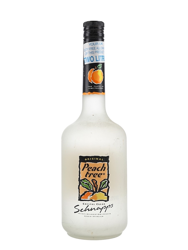A bottle of Peach Tree peach schnapps produced in the Netherlands by De Kuyper, we estimate in the 1990s.