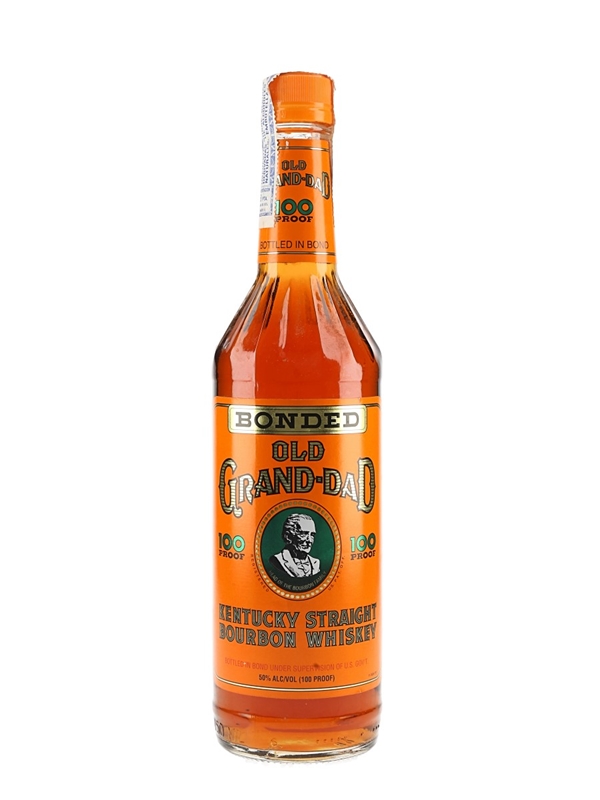 A bottle of Old Grand-Dad 100 Proof Kentucky straight bourbon whiskey. This was distilled and bottled in bond by The Old Grand-Dad Distillery Co., Frankfort.