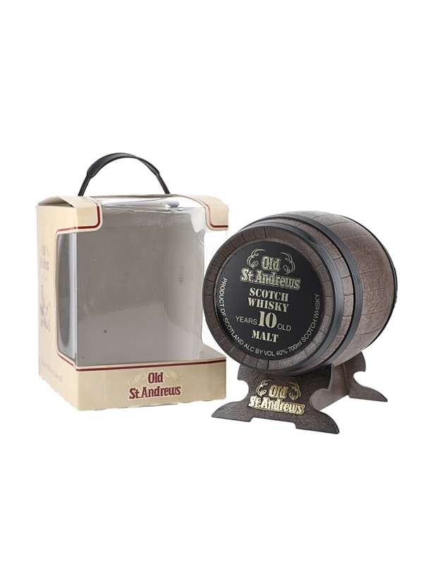A bottle of Old St Andrews 10 Year Old Malt Scotch Whisky presented in a barrel-shaped bottle.