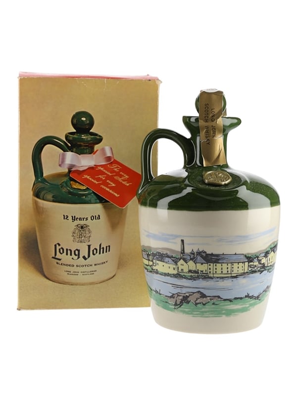 A bottle of Long John 12 Year Old blended Scotch whisky presented in a ceramic jug. We estimate this was bottled in the 1980s.