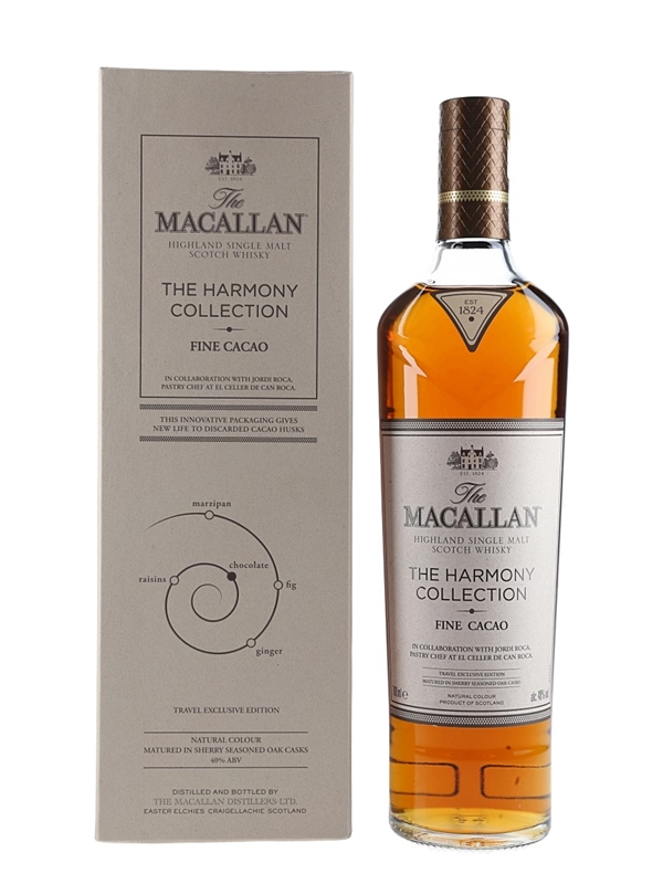 A bottle of The Macallan Fine Cacao Highland Single Malt Scotch Whisky from The Harmony Collection. This is inspired by the chocolate creations of Spanish chef Jordi Roca, pastry chef at El Celler de Can Roca. The restaurant was twice voted best restaurant in the world.