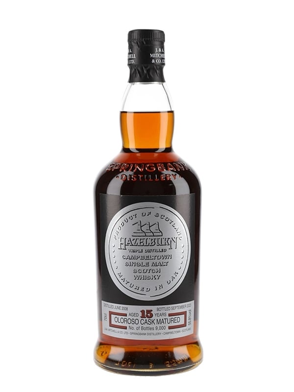 A bottle Hazelburn 15 Year Old Campbeltown Single Malt Scotch Whisky. This was triple distilled in June 2008 at Springbank distillery, matured in fresh oloroso sherry casks and bottled in September 2023. This is one of 9000 bottles.
