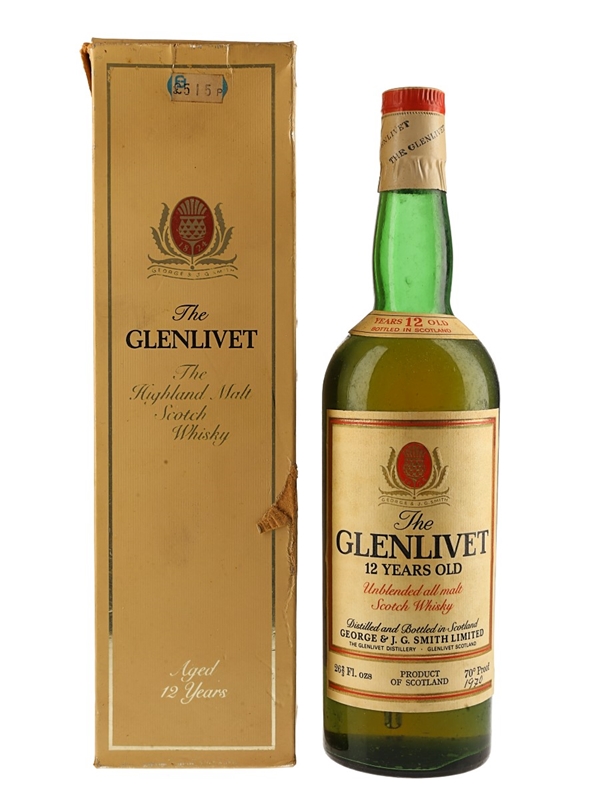 A bottle of Glenlivet 12 Year Old Unblended All Malt Scotch whisky, distilled and bottled in Scotland by George & J G Smith Limited, The Glenlivet Distillery. We estimate this was bottled in the 1970s.