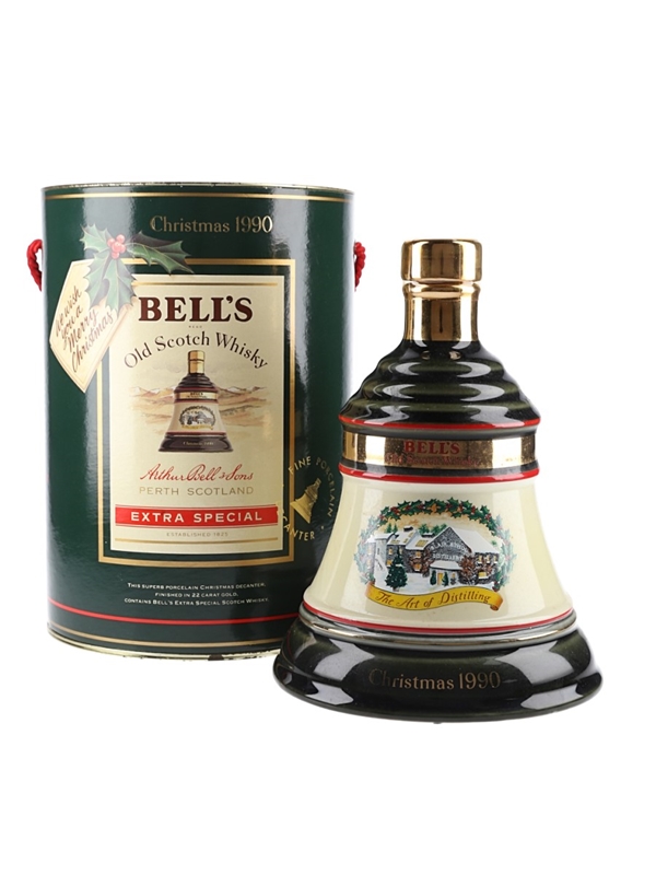 A bottle of Bell's Old Scotch Whisky presented in a ceramic decanter and released for Christmas 1990. The label depicts 'The Art of Distilling' with Blair Athol distillery blanketed in snow.