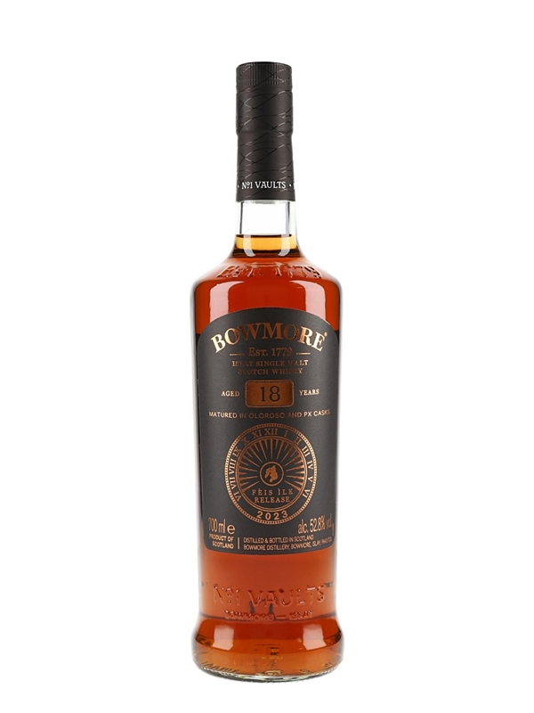 A bottle of Bowmore 18 Year Old Islay Single Malt Scotch Whisky, matured in Oloroso and PX casks and bottled at 52.8% ABV specially selected for Feis Ile 2023.