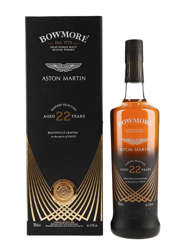 A bottle of Bowmore 22 Year Old Aston Martin Masters' Selection Islay Single Malt Scotch Whisky made in collaboration with Aston Martin.
