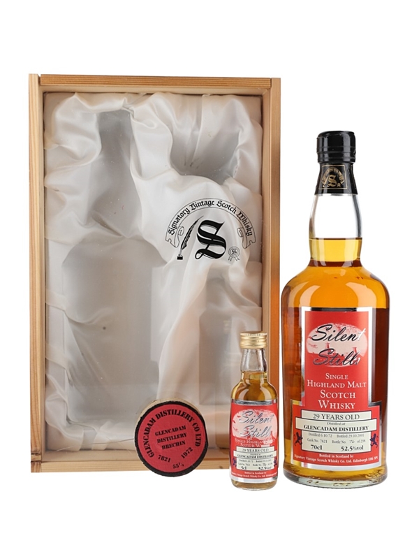 A bottle of Glencadam 29 Year Old Highland Single Malt Scotch Whisky. This was distilled on 6 October 1972, matured in a single cask and bottled at 52.5% ABV on 29 October 2001 by Signatory Vintage for the Silent Stills series.