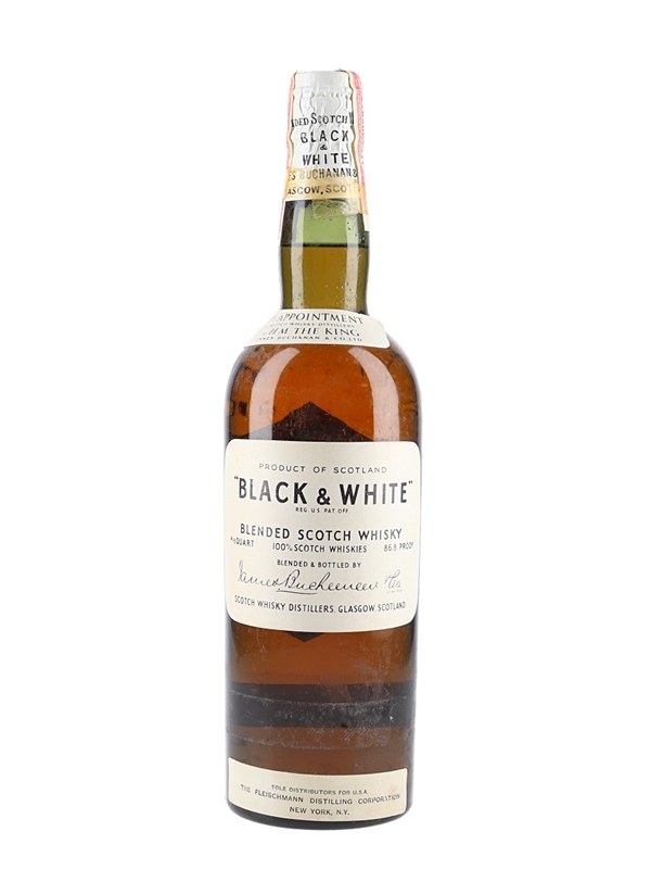 A bottle of Black & White Blended Scotch Whisky produced by James Buchanan and sealed with a spring cap closure. This was imported to the US by The Fleischmann Distilling Corporation, New York, we estimate in the 1950s.