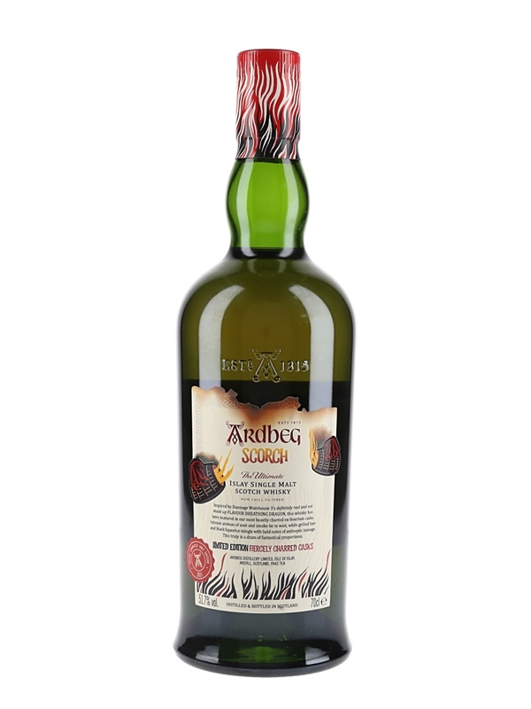 A bottle of Ardbeg Scorch Islay Single Malt Scotch Whisky. This was matured in heavily charred ex-bourbon barrels and was inspired by the Flavour Breathing Dragon which is said to live in the distillery's Dunnage Warehouse No.3.