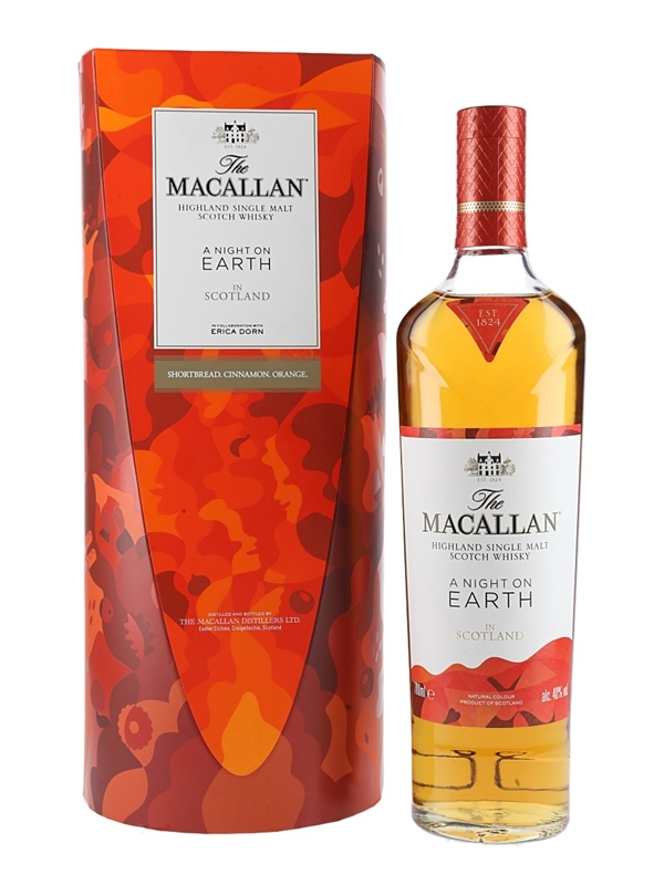 A limited edition bottle of The Macallan A Night On Earth in Scotland Highland Single Malt Scotch Whisky, celebrating the joy of New Year's Eve, known in Scotland as Hogmanay. This was aged in European and American sherry seasoned oak casks and ex-bourbon American oak casks. The packaging was designed by Japanese-French illustrator Erica Dorn.