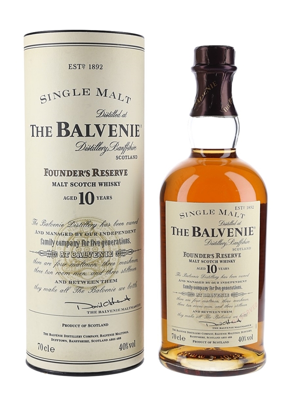 A bottle of Balvenie 10 Year Old Founder's Reserve Single Malt Scotch Whisky.