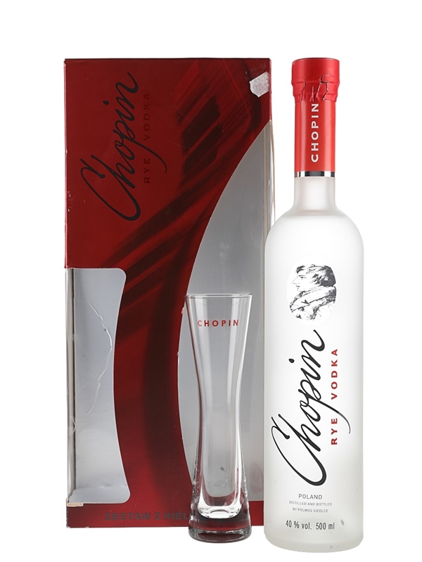 A 50cl bottle of Chopin Rye Vodka produced and bottled in Poland. This gift set comes with a branded glass.
