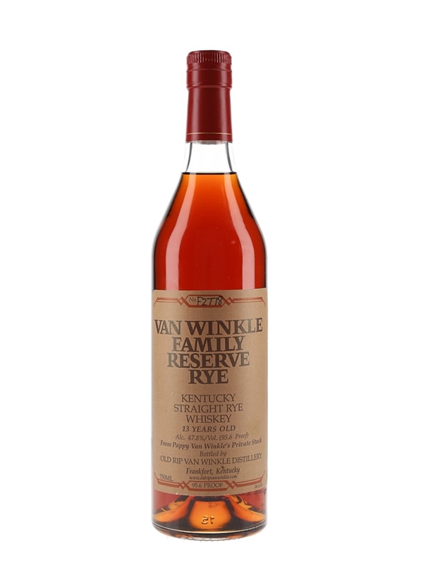 A bottle of Van Winkle Family Reserve Rye 13 Year Old Kentucky Straight Rye Whiskey, bottled by Old Rip Van Winkle Distillery, Frankfort, Kentucky, at 47.8% ABV. The bottling code indicates this was bottled in 2015.