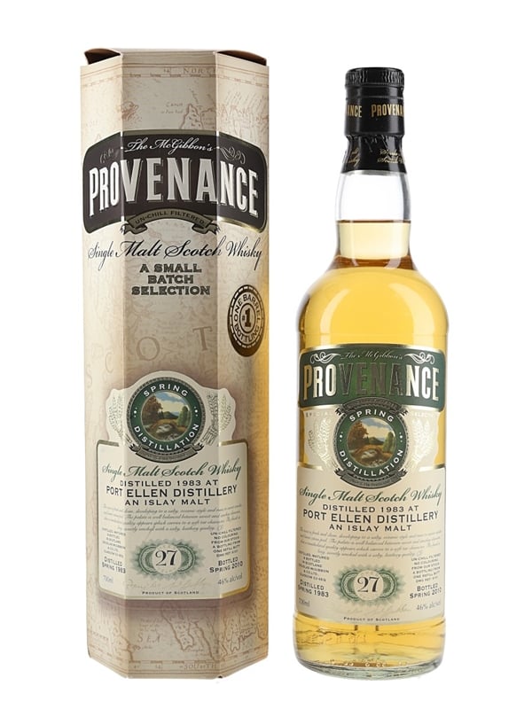 A bottle of Port Ellen 27 Year Old Single Malt Scotch Whisky, distilled in spring 1983 (Port Ellen's final season of production) and bottled in the spring of 2010 by McGibbon's for the Provenance range.